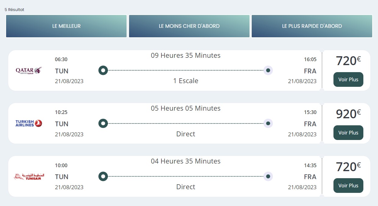 Les offres qui correspondent à vos critères de recherche seront listées clairement et vous pouvez les réorganiser facilement selon vos préférences (prix, durée…). Les prix sont affichés en unitaire et vous pouvez avoir une visibilité complète sur le prix total (surcharge carburante incluse) en sélectionnant une des offres. Les tarifs sont les mêmes appliqués par les compagnies aériennes en dehors de notre site, aucune marge n’est appliquée.